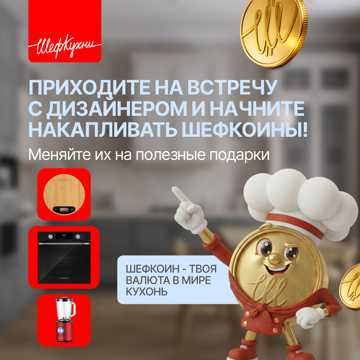 Накапливайте ШефКоины на пути к вашей идеальной кухне. Получайте ШефКоины не только за покупку, а за каждый осознанный шаг: встреча с дизайнером, замер помещения, отзывы, отметки в соц.сетях, заключение договора.